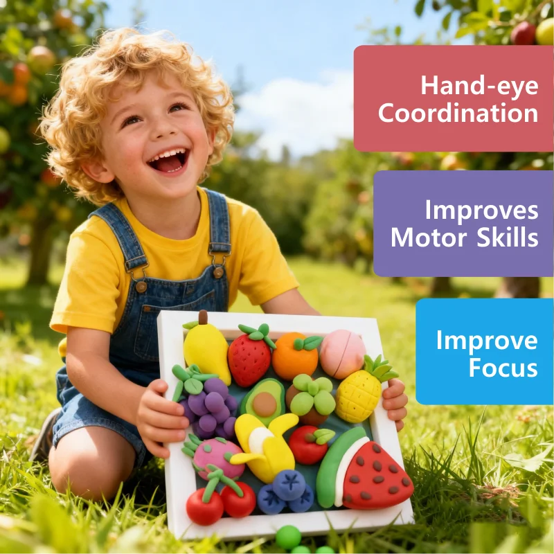 滑らかで成形しやすい粘土が含まれており、創造的な遊びをするのに十分な時間、柔らかさを保ちますが、空気にさらすとしっかりとした耐久性のある状態で乾燥します。このセットは、小さな手で粘土を転がしたり、つまんだり、押しつけてイチゴやチェリー、オレンジのスライスなど、小さな果物の形を作る過程を通じて、手指の巧緻性(fine motor skills)を養います。また、子どもたちが色を選んで額縁の周りに繰り返し模様を描くことで、色の認識力やパターンデザインの力を育みます。成形・カット・テクスチャー付与のためのシンプルなツールも付属しています。さらに、いくつかのステッカー、接着剤、および額縁のベースも同梱されているため、完成品の組み立ては簡単で達成感があります。