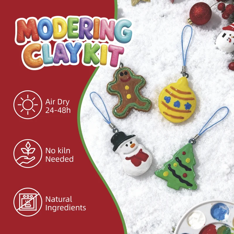 当社のクリスマステーマエアドライクレイクラフトキットは、高品質で天然由来の素材を用いて製造されており、3歳以上のお子様にも安全な、無毒・無臭・完全に安全な製品です。250gのモデリングクレイは柔らかくベタつかない質感で、小さな手でも簡単に成形・塑形できます。このエアドライクレイは窯や加熱を必要とせず、作品を常温で24~48時間乾燥させるだけで、耐久性に優れ、長期間保存可能な仕上がりになります。キットには、型押しモールド4点(ジンジャーブレッドマン、クリスマスツリー、雪だるま、ボール型オーナメント)、ペイントブラシ1本、鮮やかな6色の絵の具、6本のストラップ、および光沢仕上げ用のグロスワニス10mlが含まれており、すべてが完結した、 mess-free(汚れの少ない)クラフト体験を実現するよう設計されています。