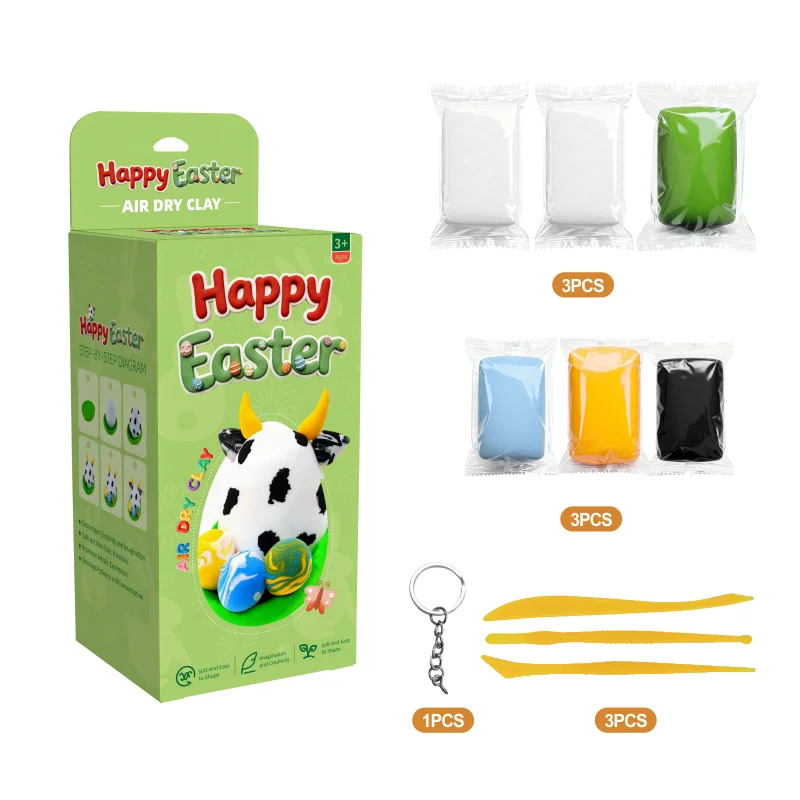 Vividyneは、プロジェクトを始めてから完成までスムーズに進められるよう、オールインワンの粘土セットを提供しています。便利なアイテムが揃っており、カラフルな粘土ブロック数個、基本的な造形用ツールセット、形状を均一に作れる小型モールド、そして小さな子どもでも安全に使える装飾用ステッカーと絵の具が含まれています。それぞれのツールは、安全性と実用性を兼ね備え、遊び心あふれるデザインで選ばれています。分かりやすいガイド付きで、愛らしい特徴(大きな目、丸みを帯びた体、小さな角)を持つ牛の作り方や、春の祭りや季節のイベントに彩りを添える複数の卵型デザインの作り方が丁寧に解説されています。完成した作品は、棚やテーブルの上でのインテリアとして、あるいは春の celebrations のためのセンターピースとしても、とても魅力的なホリデー装飾になります。