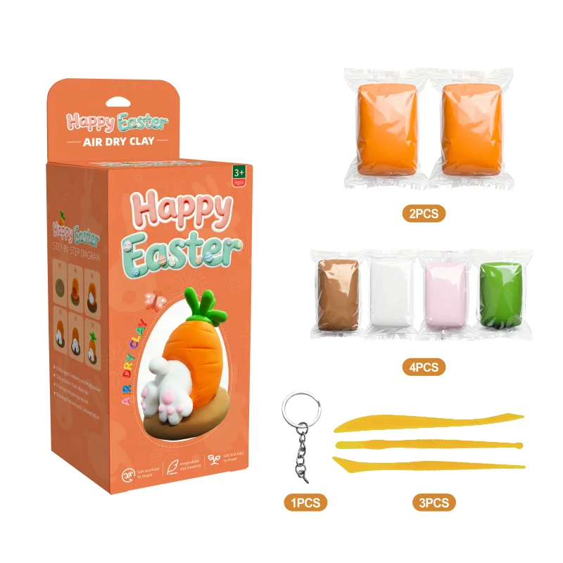イースターアートキットおよび子供向けDIYクレイカテゴリーに位置付けられた当社の『ハッピーイースター エアードライクレイセット』は、世界中のバイヤーが求める、規制対応済み・すぐに使える子供向けクラフトキットとして、トップクラスのキッズフレンドリーな3点セットです。このセットの中心となるのは、愛らしいウサギがニンジンの中に隠れているというイースター装飾フィギュアです。