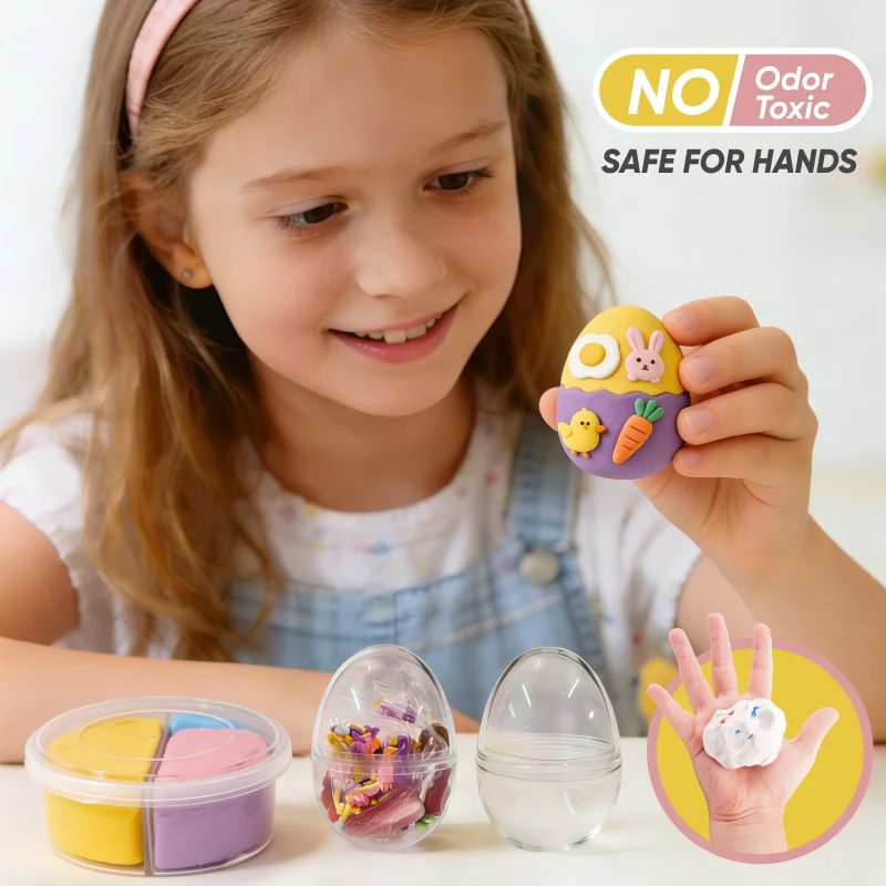 高品質素材で製造されており、EN 71-3およびASTM D-4236の安全基準を満たしています。無毒・無臭・非粘着性・色あせ防止仕様です。肌への刺激はなく、水で簡単に汚れを拭き取れるため、保護者の清掃負担を軽減します。柔らかな質感により、卵の模様など繊細なディテールまで、手軽にこねたり伸ばしたり、形作ったりできます。