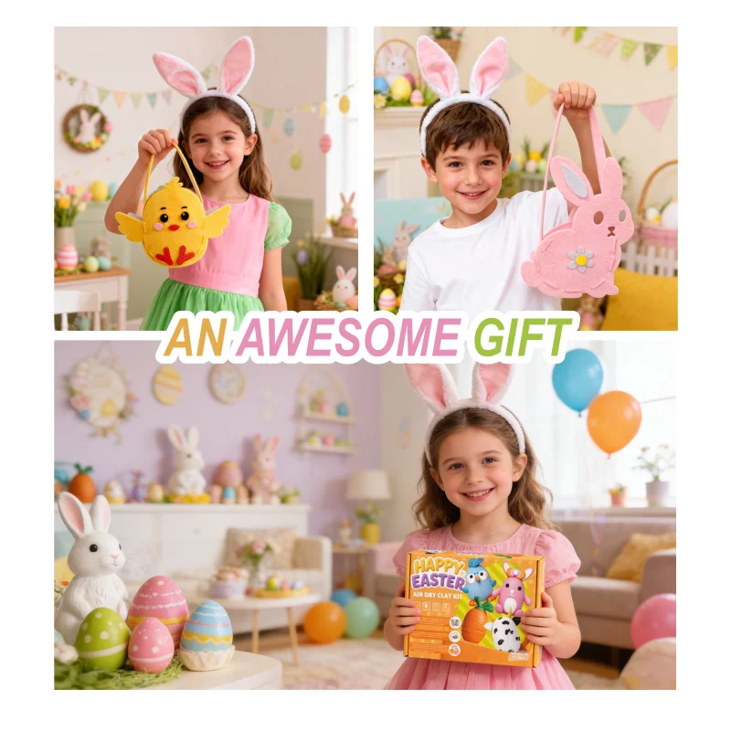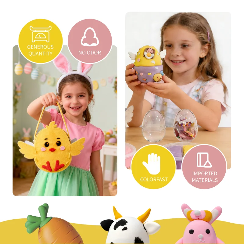 多機能性ももう一つの特徴です。このキットはイースターエッグやバスケットに焦点を当てていますが、軽量の粘土はさまざまな形状や装飾に適しています。子どもたちはウサギ、ヒヨコ、花、および卵やバスケットに取り付けるための個性的なチャームなどを作ることができます。空気乾燥式のため、完成品は装飾品、オーナメント、あるいは記念品として使用できます。保護者は、完成した作品をストーリーテリングやテーブルディスプレイの小道具として活用することで、ロールプレイを促すことができます。また、この粘土は扱いやすいため、兄弟姉妹や友人同士での共同作業を自然と促し、社会的相互作用や共有された達成感を育むことができます。