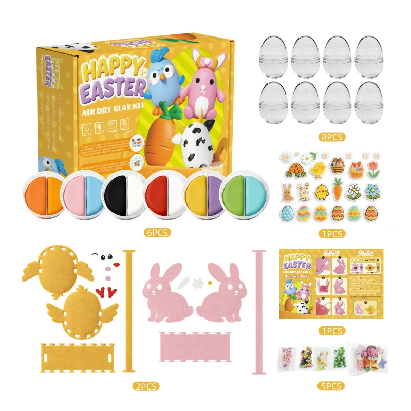 ハッピー・イースター空気乾燥粘土キット:お祝い気分を盛り上げる、安全で多様な遊びが楽しめる親子向けクラフトセット。ギフトにも最適です。すべてがセットになった1箱で完結!6色のダブルカラー粘土(ピンク、イエロー、グリーン)パック、8個の透明エッグシェル、2個のひよこ/うさぎモチーフフェルトバスケット、ステッカー、ガイドブック、付属アクセサリーが含まれており、追加の工具は一切不要。テーマに沿った部品でイースター気分を演出し、完成作品はインテリア装飾や贈り物にぴったりです。