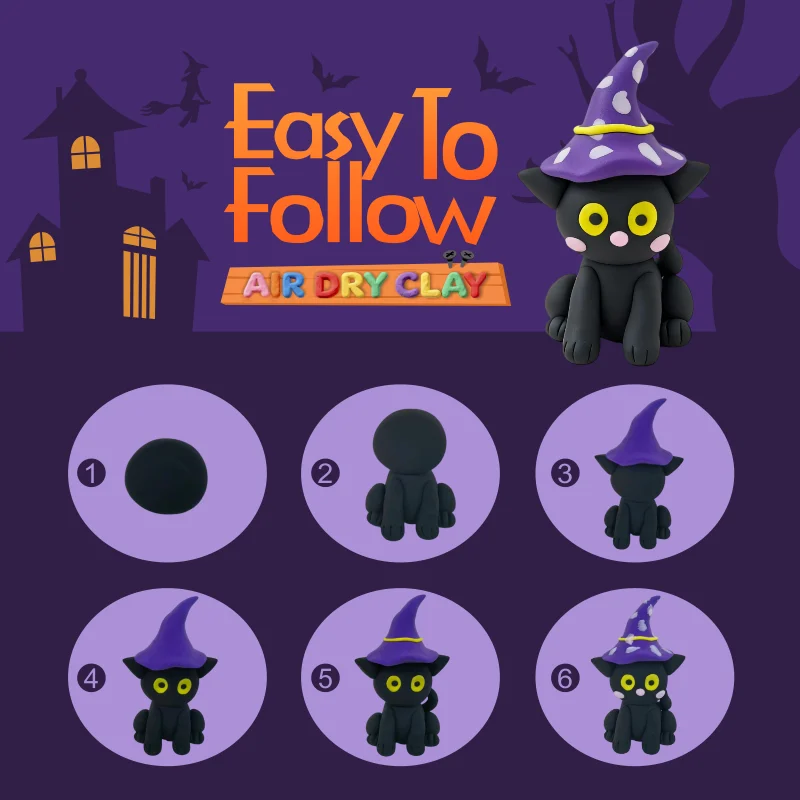 このキットには分かりやすい説明書が付属しており、子どもたちがすぐに取りかかれるようになっていますが、同時に独自の実験を行う余地も残されています。初心者の子どもたちはシンプルなテンプレートに従って、定番のハロウィンモチーフを作成できます。より経験豊富な若いアーティストたちは、色を混ぜ合わせたり、複数のパーツから構成される立体作品を制作したりと、創造の枠を広げていくことができます。空気乾燥式なので、特別な保管条件を必要とせず、作業を一時中断して後で再開することも可能です。これは多忙しいご家庭にとって非常に便利です。