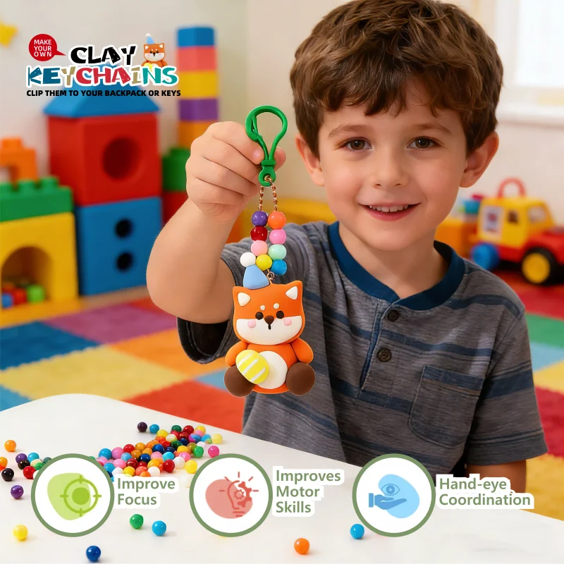 このキットは、子どもの創造性および自立した遊びを促進します。色・質感・形への探求を促し、キーホルダーを成形・組み立てる過程で、計画立案力や問題解決力を養います。ローリングやプレスといった反復動作は心地よく、集中力を高める効果もあります。保護者、教師、保育者は、この種のクラフト活動を、デジタル機器に頼らない(スクリーンフリーアクティビティ)ながらも、現代的で魅力的な学びの機会として高く評価しています。