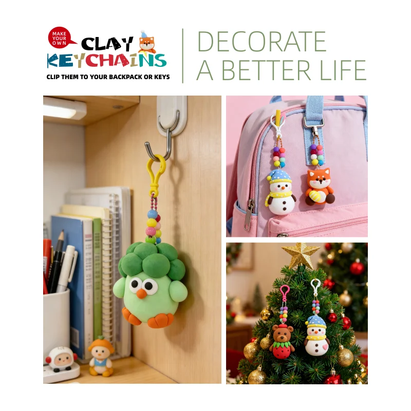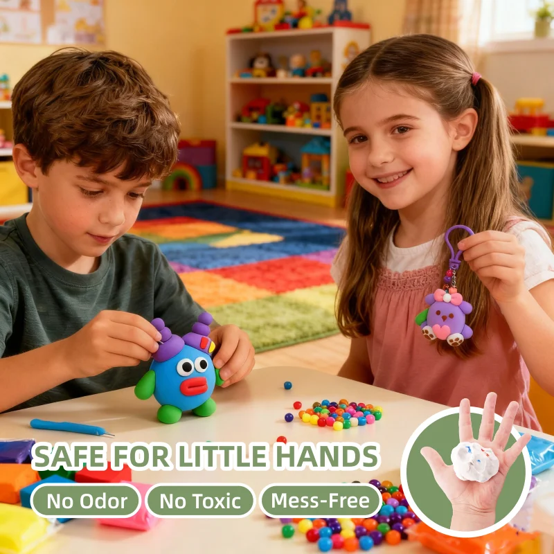安全性が最優先です。この粘土は無毒と表示されており、子どもが触って形を作ることも安全です。石鹸と水で簡単に洗い流せるため、保護者は工作の時間を安心して過ごすことができます。耐久性も考慮されています。空気乾燥後、作品は丈夫な固さに硬化し、リュックサックやお弁当箱、鍵など日常的に使用する場所でも十分に耐えられます。キットには、輝きと個性を加える小さなカラフルな装飾ビーズが含まれています。子どもたちは、お気に入りの配色に合わせてビーズを通したり、自分だけのユニークなスタイルを反映したパターンを作成したりできます。これらのビーズに、頑丈なキーホルダーリングや紐を組み合わせることで、完成品は見た目も美しく、実用性も兼ね備えたものになります。