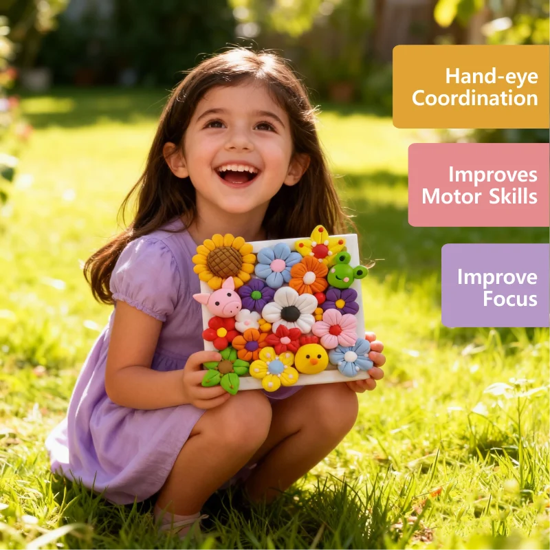 学習価値が遊びの中に自然と組み込まれています。子どもたちは粘土や道具を扱う中で、手と目の協調運動、微細運動技能、空間的思考力を養います。このプロジェクトでは、創造的な問題解決能力も促されます——たとえば、花びらの形を作り出す方法、茎を接着する方法、あるいは絵の周りに装飾を配置する方法などを自ら考え出すのです。また、子どもたちが自分のスタイルに合う粘土の色の組み合わせを選択することで、色の認識力やパターン作りの力も育ちます。大人はこの活動を通じて、植物に関する簡単な概念を教えることができ、工作と自然世界との具体的なつながりを築くことができます。完成した額縁は、家族写真、子どもの描いた絵、または学校の記念写真を誇らしげに飾るための作品となります。