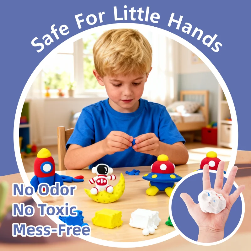 この粘土は、想像力をかき立てる明るい宇宙をモチーフにした色合いでお届けします。子供たちは色を混ぜ合わせて、星雲や彗星の尾のような新しい色調や模様を作り出すことができます。素材は最初から滑らかで柔軟性があり、適切に扱えばひび割れしにくい仕様です。また、小さな手でも長時間集中して遊べるほど、魅力的な質感を備えています。乾燥後は十分な硬度を保ち、棚に飾ったり、手作りのギフトとして贈ったりすることができます。乾燥後の作品には絵の具で着色したり、小さな装飾品を接着剤で貼り付けたりして、さらに細部まで表現を豊かにすることができます。