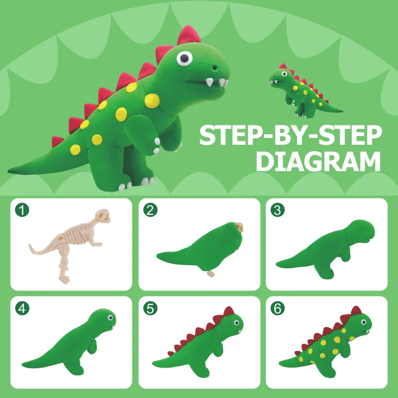 このキットには、簡単に混ぜ合わせられる柔らかい粘土が複数の色で含まれています。子どもたちは色を混ぜ合わせて、リアルな鱗模様や鮮やかでファンタジックなパターンを作り出すことができます。歯や爪、凹凸のある皮膚などの細部を表現するための粘土用ツールも付属しています。簡単なステップ・バイ・ステップ式の説明書に従って、子どもたちは自らのティラノサウルス人形を、体の成形から脚や尾の取り付けまで、一から組み立てることができます。好奇心を刺激し、物語作りを促す質問やヒントも盛り込まれており、「このティラノサウルスは何を食べていたでしょうか?」「どこに住んでいたでしょうか?」などと問いかけます。こうしたヒントにより、工作の時間は言語発達や想像力の育成を支援する学習体験へと変わります。