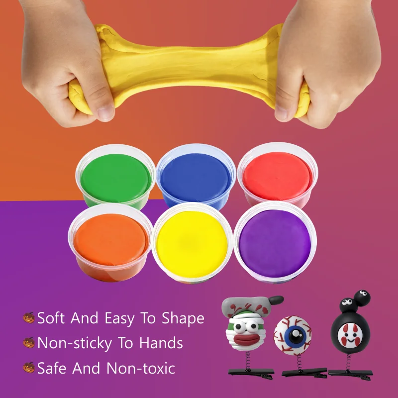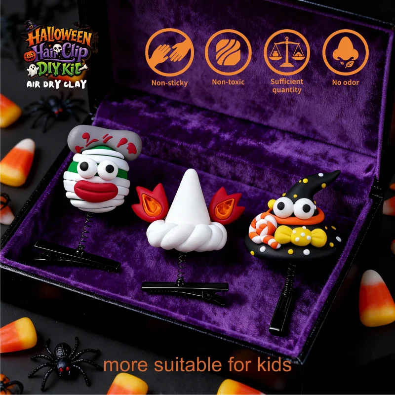 このセットには、お祝いにぴったりの多彩な色のエアドライクレイ、あらかじめカットされたフェルト台座、ヘアクリップバック、接着パッド、小さな装飾パーツ、ステッカー、および子供用安全接着剤スティックが含まれています。すべての部品は、軽量で子供にやさしいことを念頭に置いて厳選されています。保護者の方々は、素材の取り扱いや後片付けが容易であることに満足されるでしょう。教師の方々は、このキットが授業のニーズに合致している点を高く評価されます:設置が簡単、汚れが少なく、手順が明確で、活動の流れをスムーズに保つことができます。介護者の方々は、即時的な成果を楽しみにしていらっしゃいます——クレイは加熱不要で自然乾燥するため、完成品を当日中に持ち帰ることができます。Vividyne社は耐久性とデザインに重点を置いています。ヘアクリップバックは頑丈で安全で、引っかかりを防ぐための丸みを帯びたエッジが特徴です。エアドライクレイは形状をよく保持し、塗装やさらに装飾ができるほどしっかりとした仕上がりで乾燥します。子どもたちは型押しをしたり、色を混ぜ合わせたり、キットに付属する小型ツールを使って質感やディテールを加えることができます。装飾パーツは小さな手でも扱いやすいサイズで、それぞれのクリップに個性を与えます——カボチャ、ゴースト、黒猫、コウモリ、キャンディなどのモチーフが揃っています。このキットは、想像力豊かな遊びと手指の巧緻性(fine motor skill)の発達を促進します。子どもたちはクレイをつまんだり、丸めたり、小さな人形やオーナメントに成形したりしながら、楽しみながら成長できます。